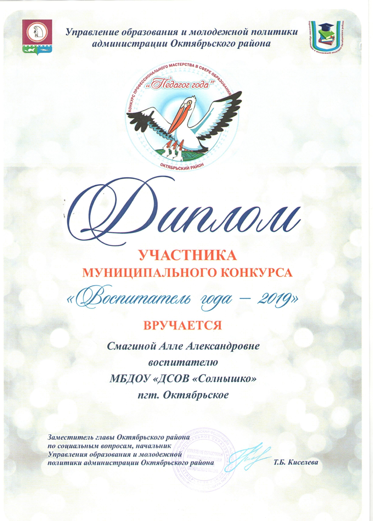 Диплом участника муниципального конкурса "Воспитатель года-2019"